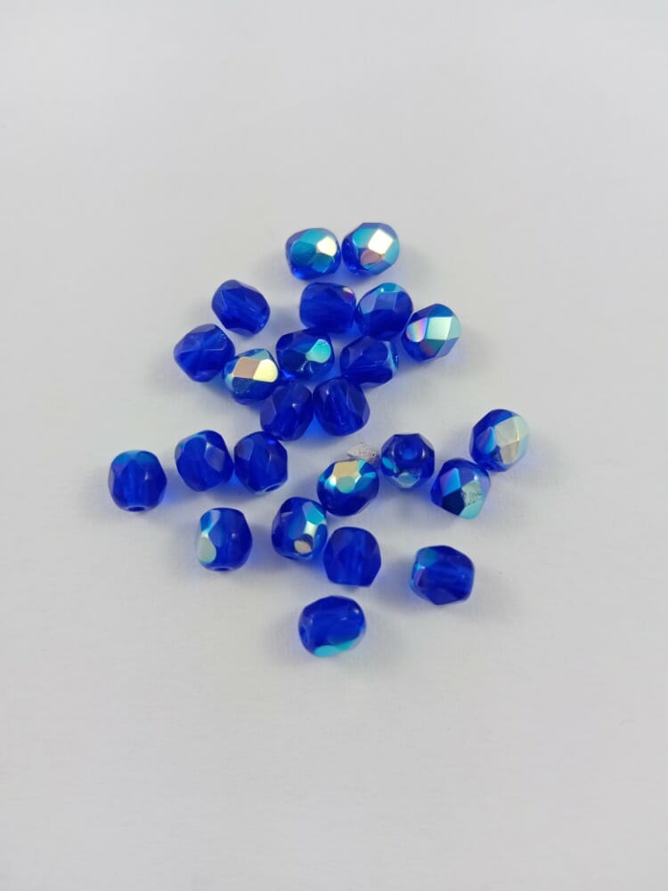 Skleněné broušené korálky, průměr 4 mm, barva modrá s pokovem AB 30080/28701.